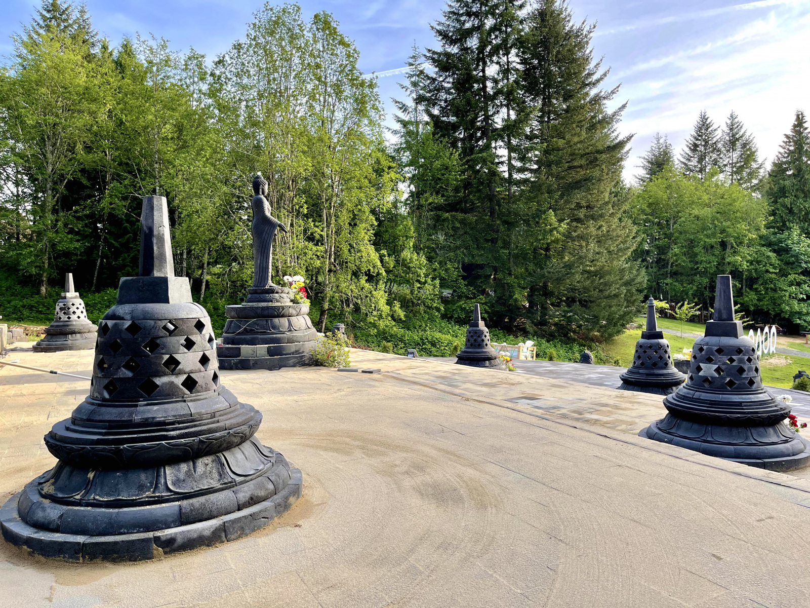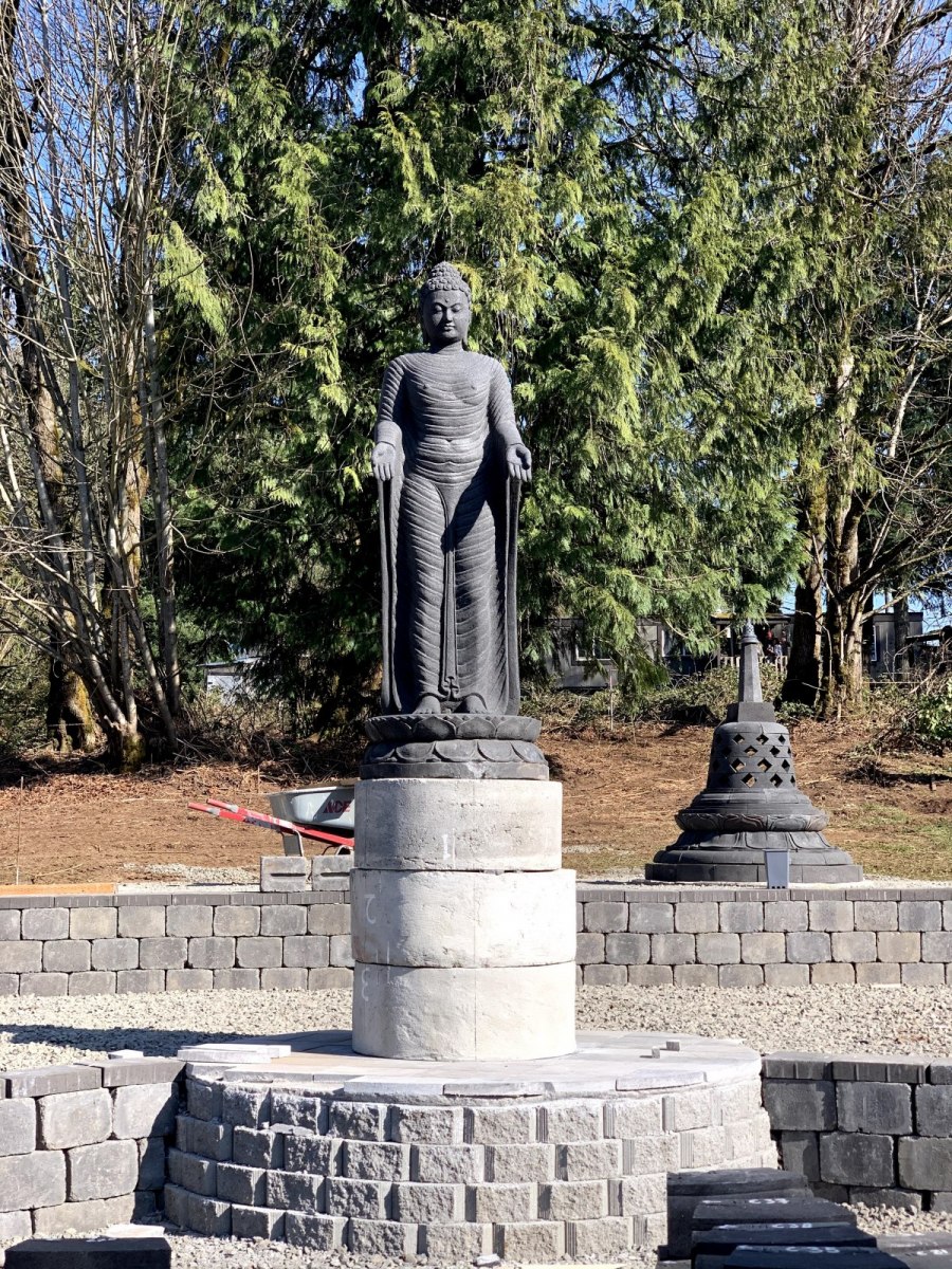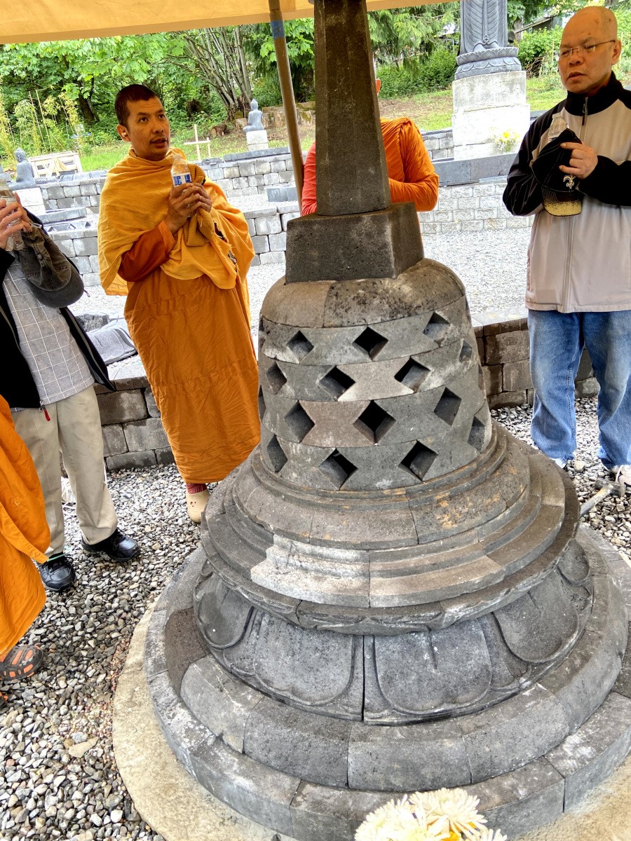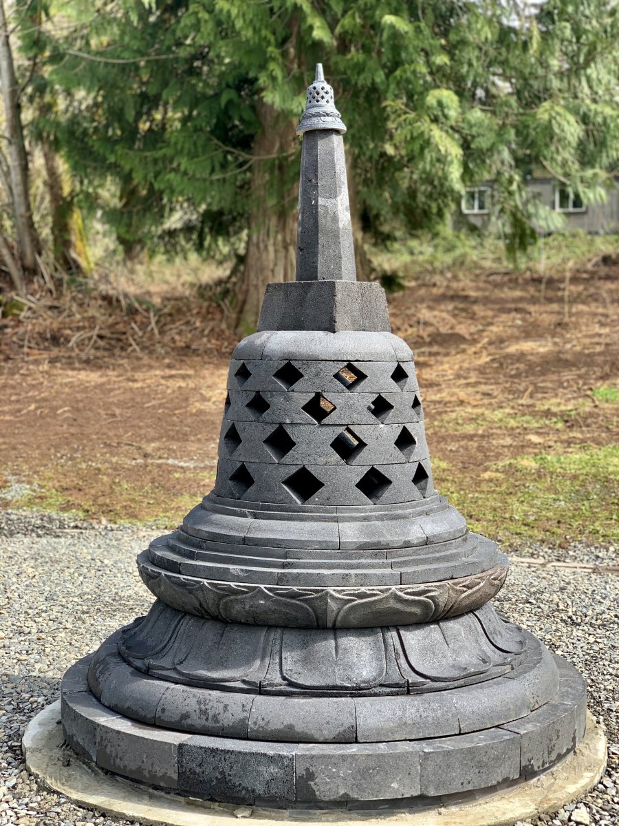 As the pagoda project first started evolving prior to the pandemic, Indonesian engineers and donors traveled to OAOR to visit the site. The engineers developed a design, and a master Indonesian lava stone carver started work using Indonesian stone. The pagodas are made of pieces that fit together like a puzzle, needing no adhesive.