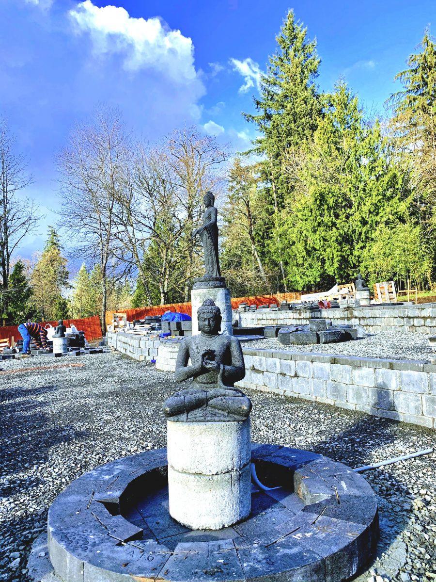 Installation began early in 2020 as weather allowed. However, the project has taken more than a year to complete, partly because the pandemic reduced fund raising and volunteers. The last steps were installing the final pavers for the upper tier, which were the last stones shipped from Indonesia.