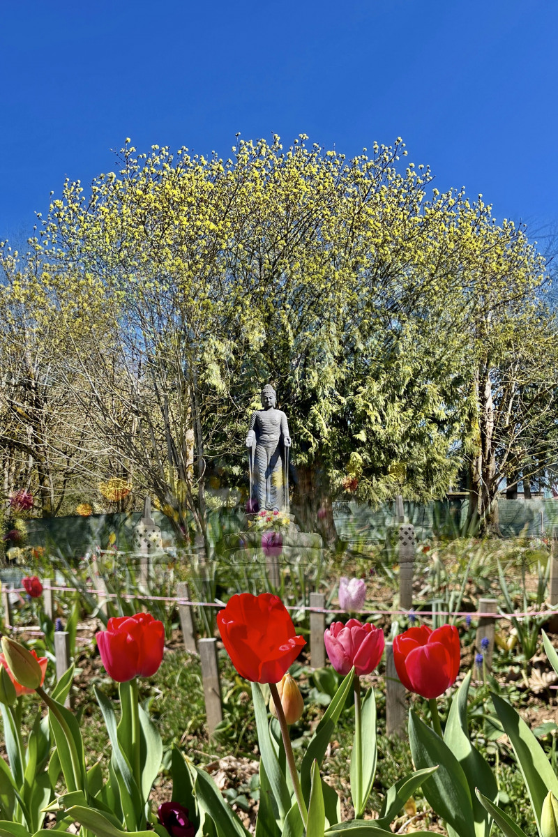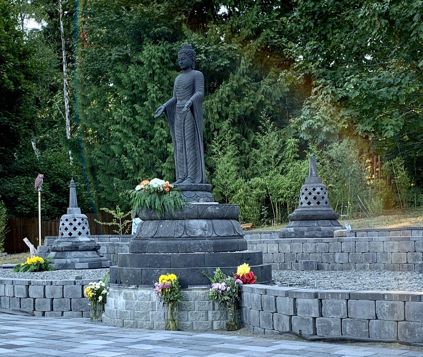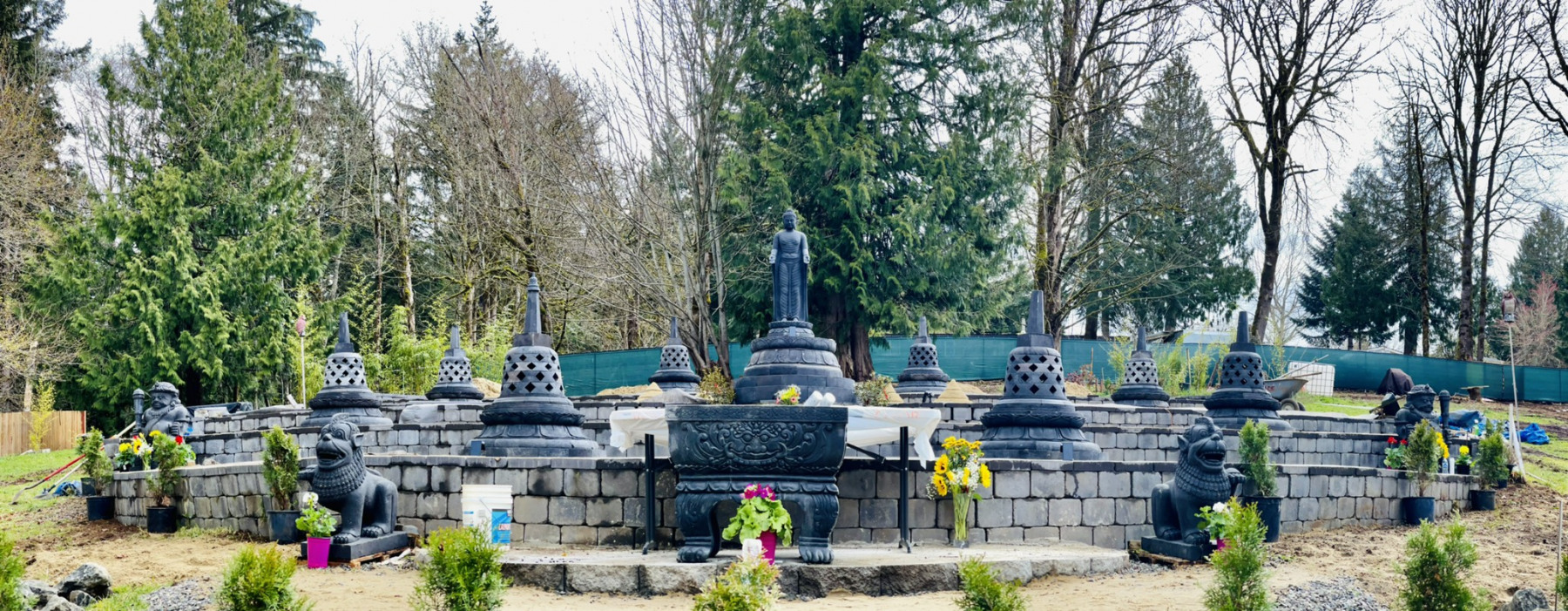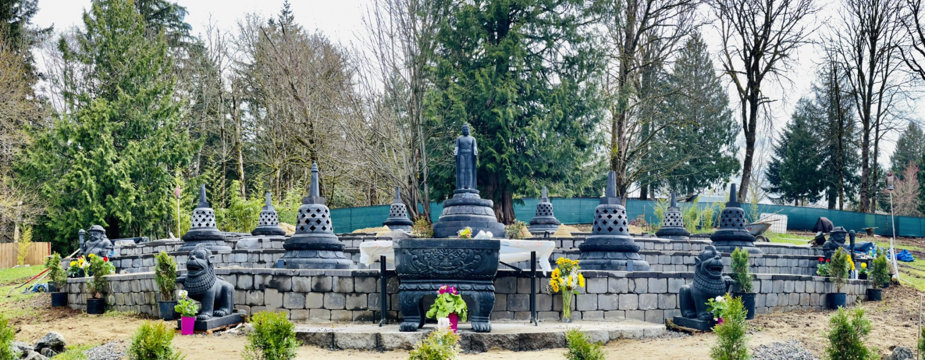 The pagoda garden is approximately 60 feet in diameter, and the standing Buddha is over six feet tall. In addition to the pagodas and standing Buddha, the garden includes four protectors, and a large standing vessel for ceremonial incense offerings.